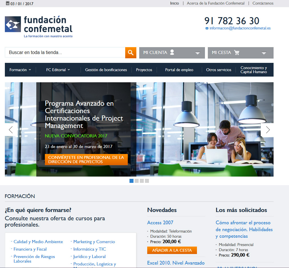 Administración y mantenimiento de la web de Fundacion Confemetal, Tienda Online realizada en Magento y blog embebido de WordPress